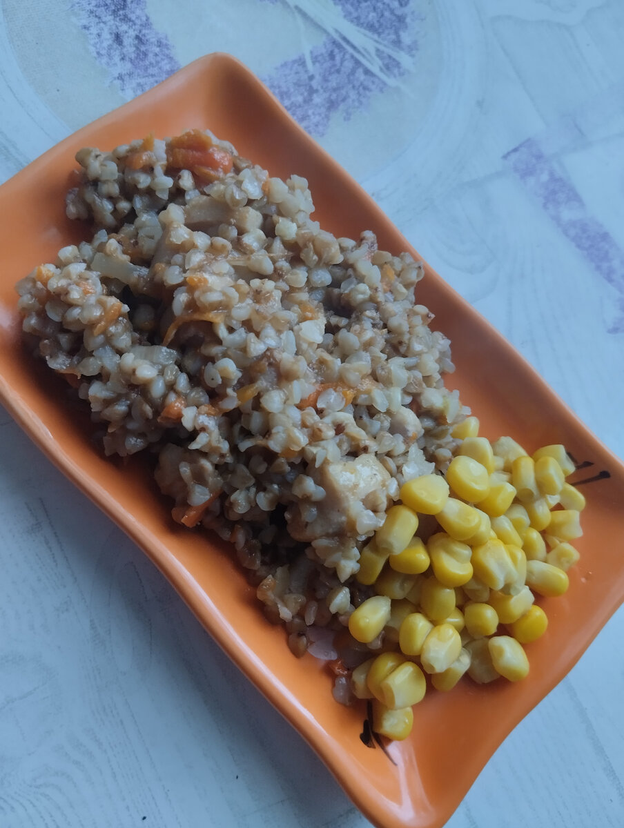 Гречка по-купечески или просто гречка с курицей, как её не назови всё равно вкусно и аппетитно. Продукты для приготовления: 1. Гречка - 1 стакан (у нас получилось 140гр); 2. Лук - 2 средних ил 1 большая; 3. Морковь 50 гр; 4. Курица 2 бедра; 5. Растительное масло для жарки - 1 ст.ложка; 6. Чеснок - 2 зубчика; 7. Вода 2 стакана. 8. Соль, перец по вкусу; Нарезаем лук Натираем морковь на крупной терке Режем курицу кубиком Выливаем на сковороду 1 столовую ложку масла, добавляем курицу, соль, перец по вкусу, и начинаем обжаривать Когда вся курица побелела добавляем морковь и лук, жарим 3 мин. Бросаем в сковороду гречку, перемешиваем. Наливаем 2 стакана воды, чтобы вся гречка была закрыта водой. И для вкуса добавим 2 зубчика чеснока Накрываем крышкой и ждем 15 минут (на маленьком огне!) чтобы вся вода выкипела. Перемешиваем и накладываем Приятного аппетита!