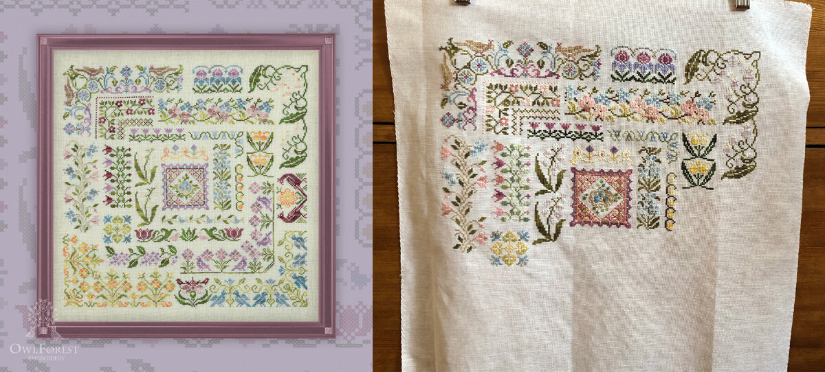 Иначе это снова затянется. А тут еще и несколько вышивальных процессов вошли в гармоничный ритм продвижений и явно нацелились на финиш. И практически сами подсказали идею майского марафона. Предлагаю познакомиться с этими вышивальными процессами. Для удобства слева будет превью, справа состояние работы на 30 апреля. "Весна-красна". Схема от Совиного леса Любимый-любимый Совиный лес! Большая работа, в итоговом размере приблизительно 40х40 см на 28 каунте. Старт весны этого года. Вышивается нитками ручного окрашивания от Совиного леса и нитками других производителей. Подробности, как и для остальных процессов, надеюсь, будет повод написать в отдельной статье по завершению работы. Чертополох от Риолис Вышивается по набору, но с заменой основы на зеленый (категорически нежелающий фотографироваться) Etamin от Ubelhor. Старт прошлого лета. Чертополох от РТО Н