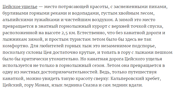 Продолжаем путешествие по Осетии. Сегодня едем в Цейское ущелье! Попадая сюда, испытываешь только одно чувство - восторг! Со всех сторон ледники! Такая красота вокруг! На этой фотографии - канатная дорога к леднику Сказка На самом деле фотографии получились не самые лучшие. И причина проста - солнце светило прямо в фотоаппарат, как раз было над ледником. К сожалению... Но как смог - так и выкручивался, и всё же вроде бы смог приспособится к этим условиям))) Людей не много, не сезон, но все же есть. И это хорошо. Чуть покрупнее сфотографировал ледник Сказка... и идём в кассу, покупать билеты на канатку. Сколько стоят билеты... к сожалению не помню... Едем! Фотографировать стало ещё неудобнее))) Но поверьте - красота неземная! По пити попадаются вот такие вот... пушки. Но на самом деле это мирное орудие - с помощью них целенаправленно "спускают" лавины в зимнее время Вид в правую сторону! Забегая вперёд скажу - при спуске фото были лучшего качества, но про спуск - в следующей статье. А м
