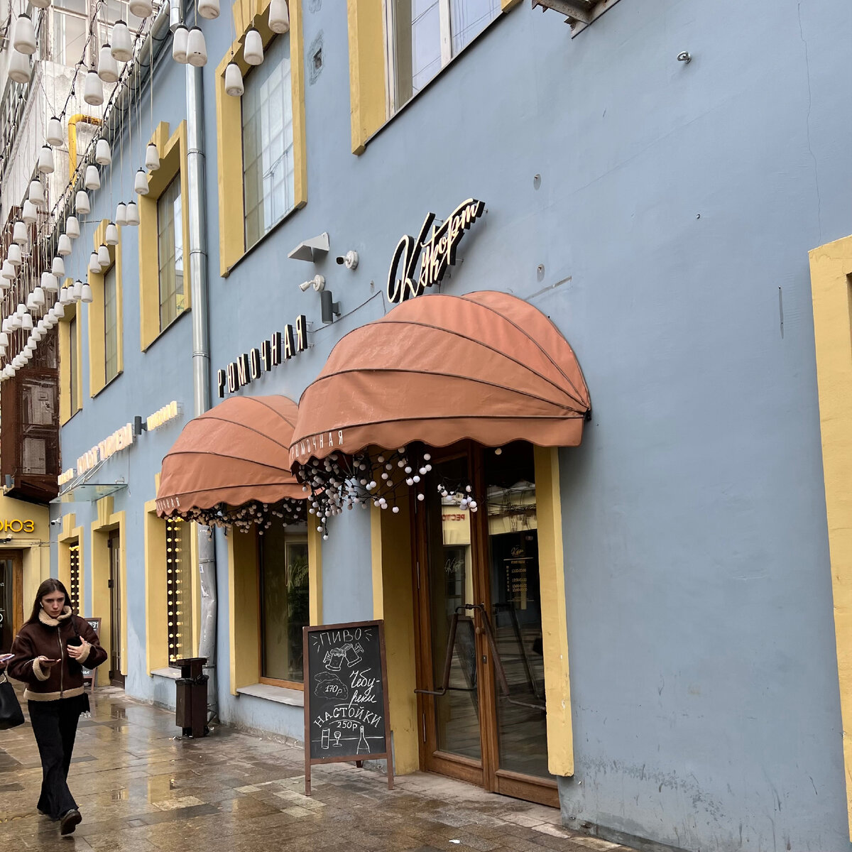 Расположение в узком проходе-коридоре. Фасад серый, отремонтированный. Сверху вывеска и два навеса, над окном и одиночной дверью входа.