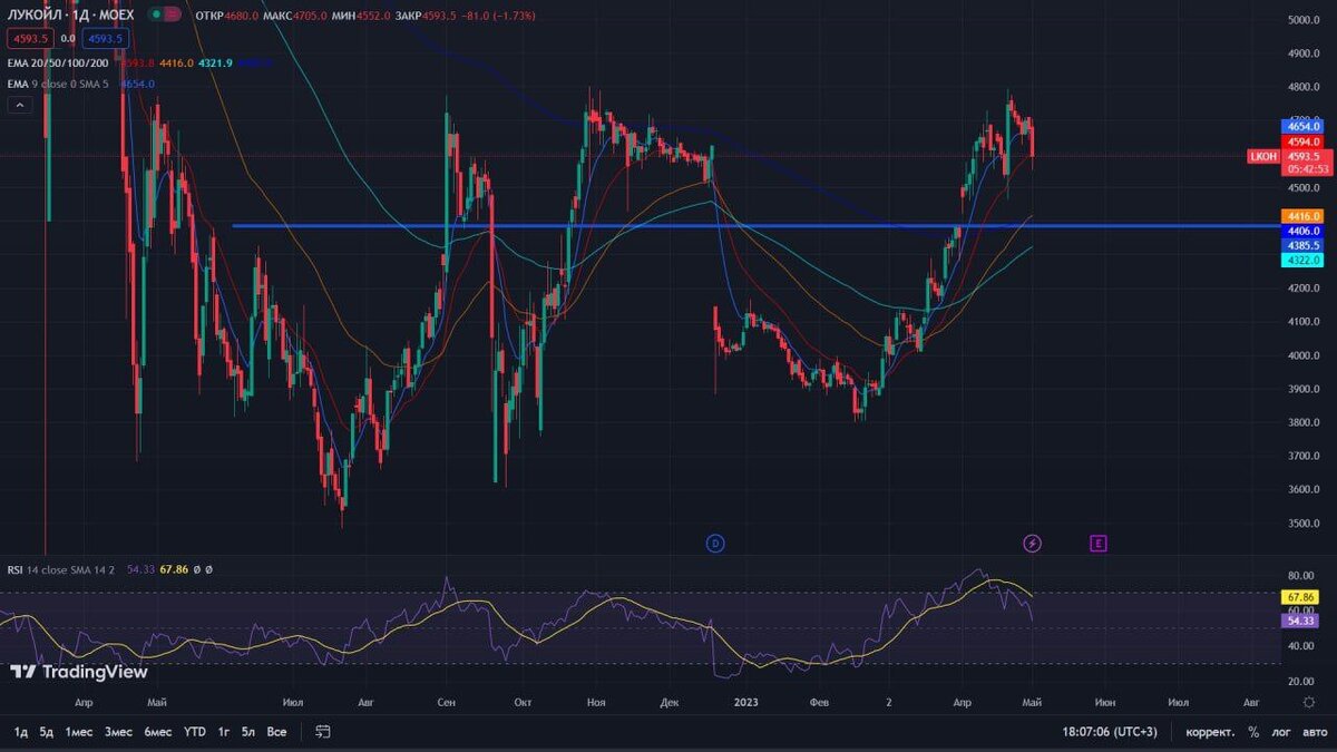 На уровне 4410₽ имеется незакрытый геп, что делает этот уровень ключевым в краткосроке. Туда будут тянуть цену и на этом уровне я готов набирать среднесрочную позицию по Лукойлу.