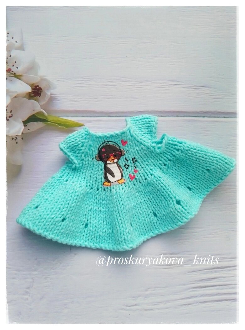 Автор МК :Светлана Проскурякова. ✨Материалы. 1.пряжа «YarnArt Jeans» № 76 2.спицы № 3 3.пуговицы 2шт. 4.ножницы. ✨ Условные обозначения. Л.п. –лицевая петля Из.п. –изнаночная петля Пр. –прибавка скрещенной петлей (или накид) Накид- так и есть накид Прибавка скрещенной петлей. ✨Данное платьице подходит на игрушку ростом 25см ✨ Описание. Кромочные входят в общее количество петель. Набрать 26 петель. 1р.-4лп, пр,1лп, пр,4лп, пр,1лп, пр,6лп, пр,1лп, пр,4лп, пр, 1лп, пр,4лп. 2р.-изн. 3р.- 2лп, накид,2вместе лиц.,1лп, пр,1лп, пр,6лп, пр,1лп, пр,8лп, пр,1лп, пр,6лп, пр,1лп, пр,5лп. 4р.-изн. 5р.- 6лп, пр,1лп, пр,8лп, пр,1лп, пр,10лп, пр,1лп, пр,8лп, пр, 1лп, пр,6лп. 6р.-изн. 7р.- 7лп, пр,1лп, пр,10лп, пр,1лп, пр,12лп, пр,1лп, пр,10лп, пр,1лп, пр,7лп. 8р.-изн. 9р.- 9лп,12петель закрыть,16лп,12петель закрыть,9лп. 10р.-9изн,5п. набрать,16изн,5п. набрать,9изн. (44) 11р.-7лп, (пр,6лп) *6раз, 1лп. (50) 12р.-50изн. 13р.-2лп, накил,2вместе лиц,46лп. 14-16 ряды по рис