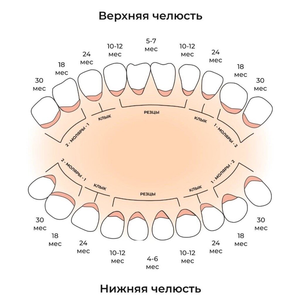 Центральные резцы на нижней челюсти, затем - на верхней. Главное, помнить, что прорезывание одного зуба обычно длится всего от 2 до 8 дней! Чтобы знать, когда ожидать появления разных зубиков - с примерными сроками вы можете ознакомиться в таблице и схеме прорезывания зубов по месяцам⬇️