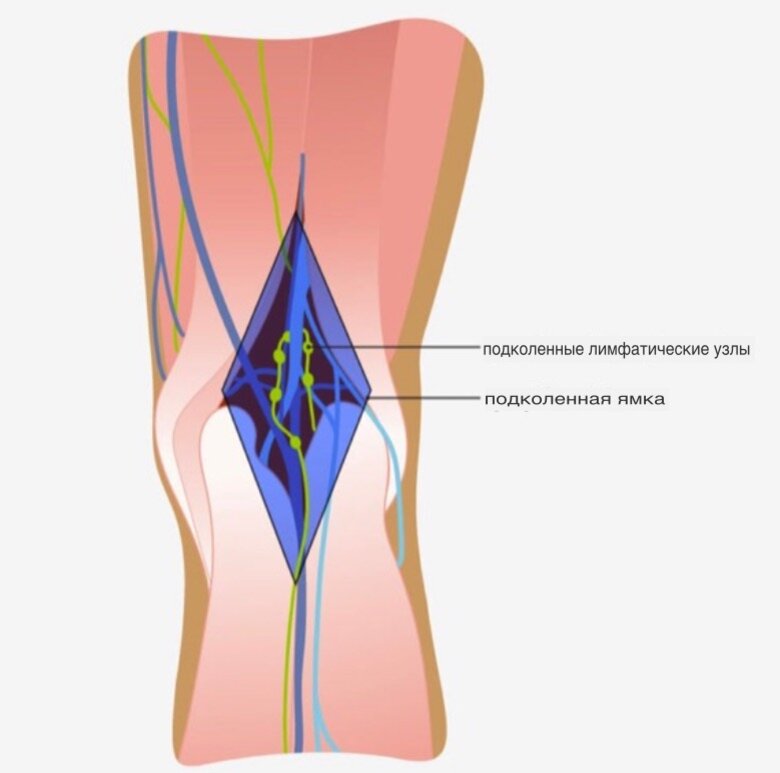 Подколенные лимфатические узлы расположены глубоко в подколенной ямке. Подколенная ямка – это ромбовидная задняя часть голени, расположенная позади коленного сустава. В каждой подколенной ямке локализуются 2-9 лимфатических узлов.