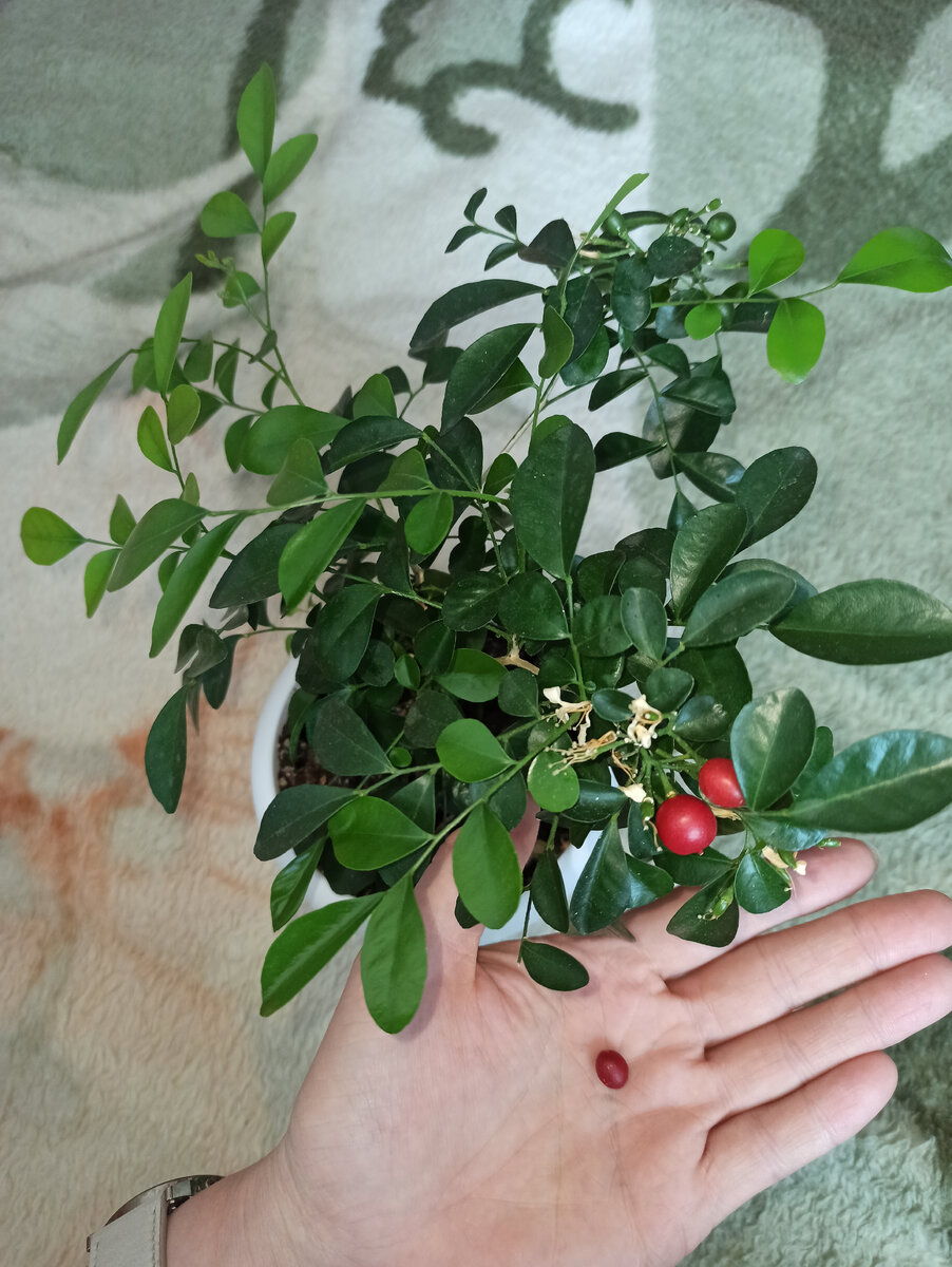 Весной я пересаживала муррайю, потому что сеянцы в подножье подросли и кривились. Взрослая муррайя в этот момент набирала бутоны. Также на ней подрастали осенние и зимние плоды. Пересадка была с потрошением корней, т.к. мне нужно было освободить корни сеянцев. Пересадки муррайя как-будто и не заметила. Ни бутонов не скинула, ни плодов. Она спокойно, обильно процвела. А вскоре начали краснеть осенние плоды.