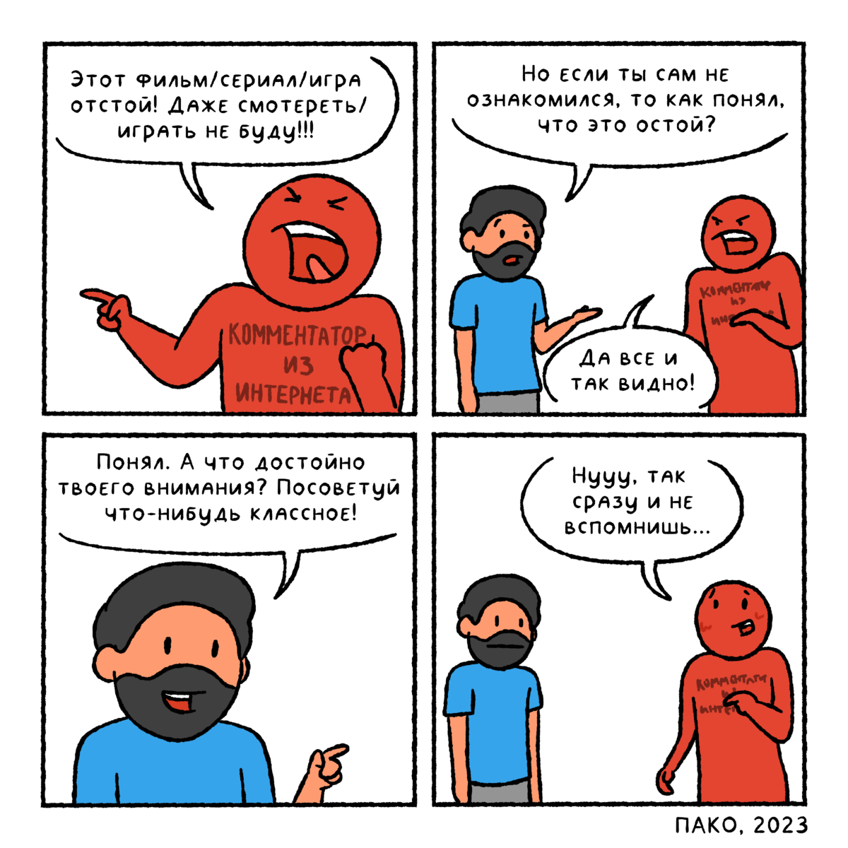 Несколько месяцев назад я решил начать небольшие скетч-комиксы о своих увлечениях, мыслях на те или иные темы или просто с историями из моей жизни. К счастью, идея эта оказалось успешной - многие из этих наспех нарисованных стрипов в итоге частенько набирают больше просмотров, чем мои остальные серии комиксов. Так что я продолжаю рисовать эти жизненные зарисовки и делится ими с вами здесь в виде подборок. Всем привет, меня зовут Павел Пако (если вы вдруг не в курсе) и в конце прошлого года я начал выкладывать в своей группе Мозги трески скетч-комиксы о себе. Десятку свежих выпусков вы можете увидеть в этой статье. Кроме того, я немного расскажу о каждом из них. Уже давно заметил, что некоторые комментаторы просто любят настрочить какие-нибудь гадости, при этом не добавляя никакого конструктива. Как-то раз под одним из моим комиксов про видеоигру, человек начал писать какая эта игра отстой, хотя сам он в нее не играл. Я ради любопытства попросил его порекомендовать хорошие игры и он ту