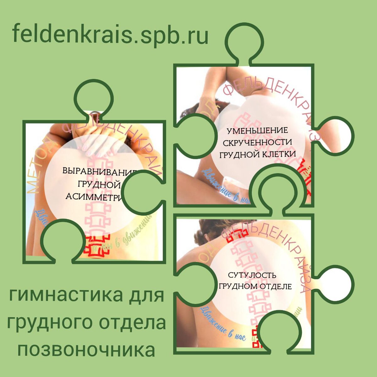 Эффективный комплекс упражнений для позвоночника должен учитывать все особенности нарушения осанки и быть максимально доступным для занятий дома. Изменение положения грудной клетки и ее фиксация происходили постепенно, а значит возвращать ее подвижность и равновесие нужно в несколько этапов: В такой последовательности вы будете двигаться в упражнениях для грудного отдела позвоночника по методу Фельденкрайза. Этот комплекс видео уроков движения подходит для занятий в домашних условиях. Все движения выполняются медленно и плавно, не требуют больших усилий, а гимнастика для спины лежа на полу является максимально комфортной и безопасной. Уроки движения по методу Фельденкрайза: Гимнастика для выравнивания грудного отдела позвоночника возвращает грудной клетке симметрию и раскрывает ее. Помогает выровнять спину, улучшить качество дыхания, вернуть энергичность и выносливость. УПРАЖНЕНИЯ ДЛЯ ГРУДНОГО ОТДЕЛА - КУПИТЬ>> Метод Фельденкрайза – это урок движения и не является лечебной физкультурой