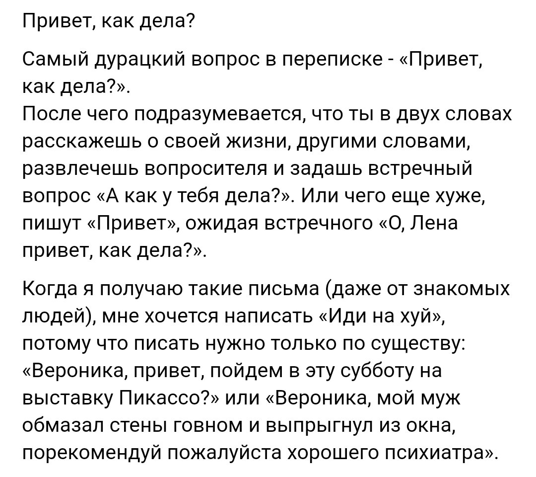 Наткнулась на пост психологини (смотри картинку ниже). Все той же, ага. Всё-таки иногда я ее обожаю. Не буду писать кого. А то она мне за предыдущую рекламу ещё не заплатила. Я тоже не фанат переписок и разговоров по типу "очень хочется языком пошевелить/на себя внимание обратить". Мне иногда звонят некоторые. И явно ждут от меня чего-то. Дышат в трубку, хаха. Елозят, вздыхают, что-то рассказывают бессвязное. Повторяют по 10 раз "такие дела". Потом долго и тягомотно прощаются, что-то пытаются придумать, что бы ещё сказать... Я почти уверена, что это все от недостатка тактильных ощущений. Объятий. "Груминга". Вы ведь знаете, что такое груминг? Когда одна обезьянка ищет блох у второй. Это не только гигиеническая процедура, но и способ проявить симпатию, заботу. У лошадей ещё есть свои грумеры. А теперь ещё появились и целые салоны грумеров для собак и кошек, но это не то. Я про другое. Человек всё-таки во многом животное. И в хорошем и в плохом. Мы сейчас все слишком сдвинулись на интел