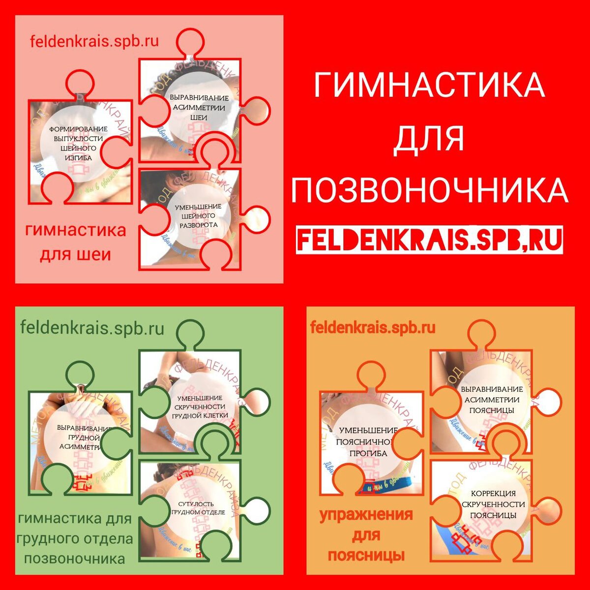 Чтобы боль в спине не стала постоянным спутником, необходимо поддерживать здоровье позвоночника самостоятельно: Комплекс упражнений для спины по методу Фельденкрайза поможет вернуть равновесие и гибкость позвоночника на трех уровнях: в грудном, поясничном и шейном отделах. Упражнения составлены под потребности каждого из отделов позвоночника и подходят для занятий дома. Видео-упражнения для позвоночника по методу Фельденкрайза: Выбирайте подходящий комплекс упражнений для позвоночника и присоединяйтесь к урокам по методу Фельденкрайза. ГИМНАСТИКА ДЛЯ ШЕИ - КУПИТЬ>> УПРАЖНЕНИЯ ДЛЯ ГРУДНОГО ОТДЕЛА - КУПИТЬ>> КОМПЛЕКС ДЛЯ ПОЯСНИЦЫ - КУПИТЬ>> Метод Фельденкрайза – это урок движения и не является лечебной физкультурой. При сомнении в целесообразности выполнения следует обратиться к врачу.