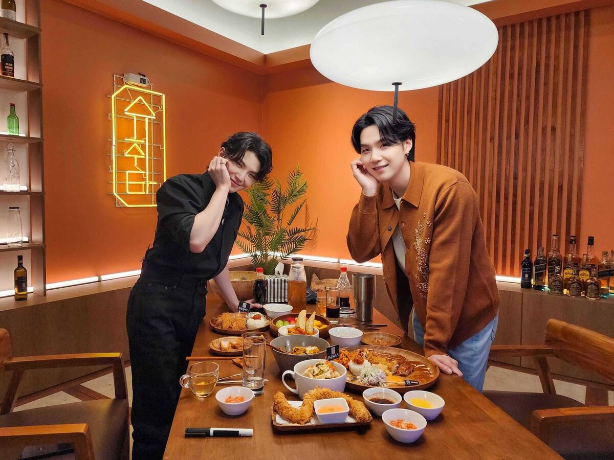 Юнги не устает принимать гостей на своем шоу, и в этот раз на Suchwita заказал столик автор песен, продюсер и вокалист группы Seventeen - Ли Джихун, более известный как Уджи. Когда я писала статью о внешне похожих айдолах, в комментариях прислали фото Уджи и Юнги, отметив, что многие считают их схожими. Как оказалось, так думают не только фанаты, но и сами артисты, а посмотрев выпуск, я в этом убедилась. Мы видим, что без подписки нас читает 50% людей🥺 Присоединяйтесь к нашей команде, чтобы не пропустить выход нового интересного контента о Корее и ваших любимых айдолах. Юнги рассказал, что, узнав о появлении Уджи на шоу, Намджун пошутил, назвав парней двойниками, а сам Шуга признался, что перед съемками эпизода попросил стилистов сделать ему и Уджи одинаковые прически. Юнги определенно импонирует их внешнее сходство, он даже сказал, что, глядя на Уджи, вспоминает молодого себя (ну да, он у нас пожилой мужчина уже😂). Парни также назвали себя братьями, а когда беседа зашла о возможном