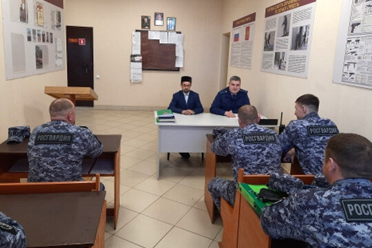 В г. Агрызе для сотрудников отделения вневедомственной охраны Росгвардии организовали встречу с представителями городской прокураторы, мусульманской традиционной религиозной конфессии и ветерана подразделения. Мероприятие имело просветительский характер, а также было направлено на формирование у сотрудников высокого правосознания, повышения уровня правовой культуры и служебной дисциплины. Перед росгвардейцами выступили помощник прокурора прокураторы Агрызского района республики юрист 1 класса Ильнур Галимарданов, мулла Хазрат мечети «Нур» Рамиль Фатхуллин и ветеран отделения вневедомственной охраны майор милиции в отставке Ильшат Хисматуллин. В ходе общения помощник прокурора разъяснил сотрудникам нормы действующего законодательства Российской Федерации в различных сферах, довёл актуальные примеры из прокурорской и судебной практики, ответил на интересующиеся вопросы правового характера. Священнослужитель посвятил своё выступление теме воинского служения Отечеству и обратился к стражам