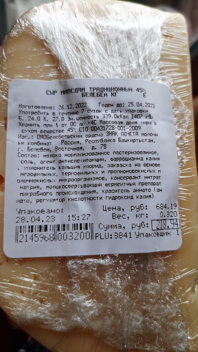 Здравствуйте, купила в магазине сыр, прочитала на этикетке что это именно сыр а не молокосодержащий продукт, решила дома повнимательнее посмотреть, прочитать состав и вот что я увидела: Изготовлен 26 декабря 2022г, годен по 25 апреля 23г. После чего, уже 28 апреля 2023г сыр расфасован и чесно написано, что после фасовки годен в течении 7 суток. Вас ничего не смущает в датах? Развесили и упаковали уже после истечения срока годности??? Как так могут делать в крупном магазине, не павильончик какой? Возмущена конечно, вернулась бы в магазин - но он не рядом с домом, по дороге с дачи заехали.. но будет оказия - зайду, спрошу заведующую наверно. Или может я чего не понимаю?? Но по моему магазин не должен уже ни продавать , ни фасовать продукт с закончившимся сроком годности. Пока не доехала до них, в выходные только смогу, подскажите как правильно поступить, ведь там ни 1 кусочек этого сыра был, а довольно много, не хочу что бы и другие покупали просрочку не ведая того... Всем здоровья