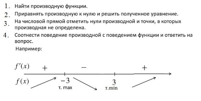 Алгоритм нахождения точек минимума и максимума с помощью производной: