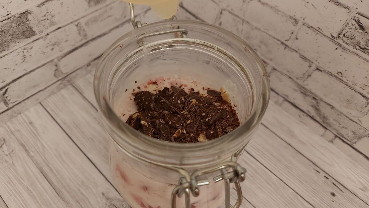 Вкусный прохладный завтрак освежит после сна. Структура этого блюда очень необычная, она напоминает вкусный десерт. Свежие фрукты, ягоды и горький шоколад в эффектной комбинации подарят потрясающие ощущения. Калорийность и количество ингредиентов на порцию указаны в конце рецепта❗ Процесс приготовления: ✅В банку всыпать овсянку, йогурт, молоко, мед и ванилин. ✅Закрыть емкость крышкой и тщательно встряхнуть. Все ингредиенты должны хорошо перемешаться. Можно сделать тоже самое ложкой до закрытия банки. ✅Вишню 🍒нарезать на небольшие кусочки. Шоколад 🍫разрубить ножом в крошку. ✅Поверх овсянки в банке выложить вишню, засыпать ее шоколадной крошкой. Теперь нужно закрыть банку и оставить в холодильнике на одну ночь. 🍧 👉Такое блюдо в холодильнике может храниться до трех дней🤗 Полезный лайфхак😉 Овсянку в банке можно заготовить на несколько дней. И тогда вам не придется задумываться о том, что же приготовить на завтрак. Подается овсянка в охлажденном виде. Ингредиенты: 🍴Ов