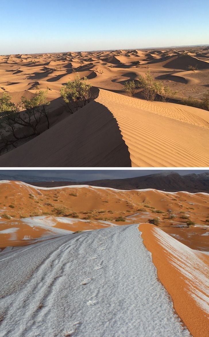 Большинство из нас думают, что пустыни — самые жаркие места на планете, и там не может выпадать снег. Что ж, видимо, многие из нас ошибались. Снегопад в пустыне явление не очень распространенное, но все же бывает. Снежное зрелище было видно даже из космоса.