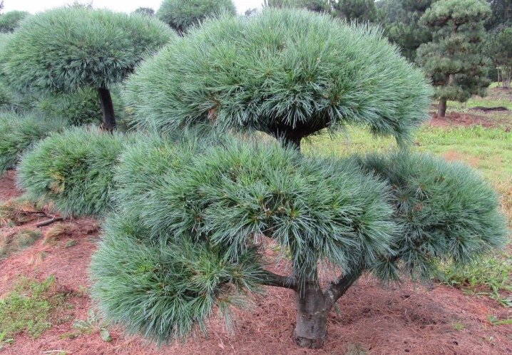 В последнее время большой популярностью для оформления загородных участков пользуются сосны. Они быстро растут, великолепно выглядят в любое время года. Ну, а аромат хвои после дождя, просто божественен. Если вы хотите посадить у себя зеленую красавицу, то обратите внимание на сосну Веймутова Радиату. Она сильно отличается от сосны обыкновенной, которая растет повсеместно в России. Особенности сосны Веймутова Радиата. - Относится к медленнорастущим сортам. Ее годовой прирост составляет всего 10 см. К 30 годам вырастает до 3 метров. Максимальная высота взрослого дерева едва достигает 4 метров. - Имеет необыкновенные иглы. Их длина составляет 10 см. Количество хвоинок в пучке – от 3 до 5. - Цвет хвои – зеленый, который осенью становится серебристо-голубовато-зеленым. - Шишки узкие, цилиндрические. Их длина составляет 7 – 15 см. - Крона очень плотная, округлая, имеет шаровидную форму. - Зона морозостойкости 3, то есть не боится морозов до – 40С. При этом молодые сосны нуждаются в укрыти