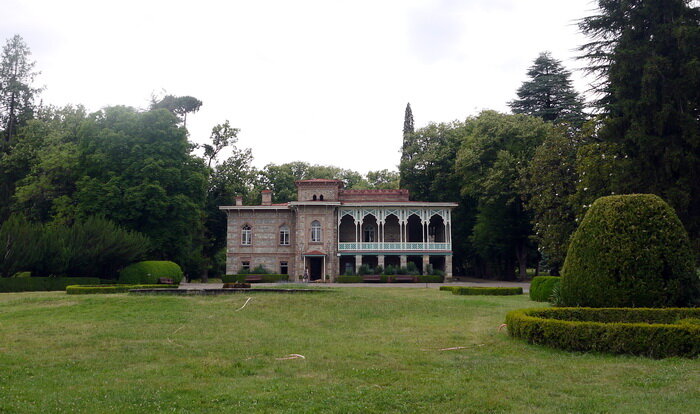 Цинандали — это еще одна кахетинская деревня, которая дала название знаменитому белому вину. Расположена она на склоне горы Гомбори в 10 км от Телави, на высоте 560 м над у.м. Признаюсь, всю дорогу я проспала, не видела ни деревни, ни современного винзавода (он, правда, не работал), ни винного магазина, в котором муж купил еще одну бутылку чачи, но уже заводской, 40-градусной в подарочной упаковке. Но основной нашей целью было посмотреть знаменитое имение княжеского рода Чавчавадзе.