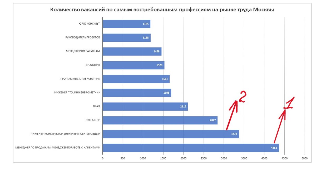 Наши эксперты провели анализ рынка труда Москвы на количество вакансий по самым востребованным профессиям и должностям. Исследование проведено по данным трех ведущих интернет агрегаторов поиска работы Москвы. По результатам исследований установлено, что наибольшее количество вакансий на апрель размещено по специализации – менеджер по продажам, менеджер по работе с клиентами. Москва — это город, где преобладает сфера услуг, поэтому результат является предсказуемым и вероятность продолжения данной тенденции сохранится на ближайшие несколько лет. Также из сферы услуг вошли такие специализации: бухгалтер, врач, аналитик, менеджер по закупкам, руководитель проектов и юрисконсульт. Неожиданным результатом стало количество запросов по специализации – инженер-конструктор, инженер проектировщик. Кроме того, пятым по количеству запросов стала специализация инженер ПТО, инженер-сметчик. Это показывает, что формируются новые производства и объекты строительства. В дальнейшем эти процессы будут спо
