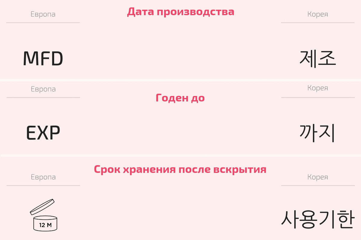 Многие интересуются сроками годности корейской косметики, сколько хранить, сколько хранить после вскрытия и можно ли использовать после окончания срока годности. Стандартный срок хранения большинства корейских продуктов - 3 года с даты производства. Ниже мы привели пример как корейскими символами обозначается срок (если вдруг это не прописано английскими буквами): Действительно, некоторые корейские бренды по-разному указывают сроки, кто-то прописывает «годен до» (их большинство), а кто-то прописывает дату производства, от которой необходимо отсчитать 3 года (такое встречается у таких брендов, как, например, Too cool for school или Missha). Несмотря на стандартный срок годности в 3 года, некоторые средства имеют срок в 24 месяца (2 года) - как, например, известный космецевтический бренд Ma:nyo. Также на некоторых средствах можно встретить небольшой значок в форме баночки с открытой крышкой и цифрами на ней. Этот символ означает, что у средства ограничен срок хранения после вскрытия уп