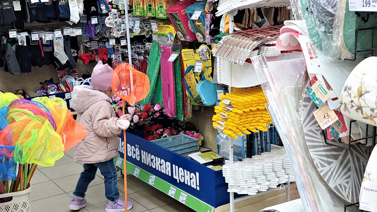 Малышка девочка уже нашла, что хотела купить - оранжевый сачок на палочке! Любитель природы подрастает, будет ловить бабочек, изучать!