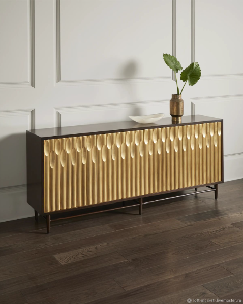 Четыре дверцы этого буфета с отделкой цвета эспрессо украшены ребристыми деталями цвета «золотой берег» с вогнутыми деталями в верхней части. Изготовлен вручную из древесного композита, массива бука, кленового шпона и стали. Оснащен нажимными защелками и европейскими петлями от Германской фирмы Hettich, что обеспечивает долгий срок службы и плавное открывание дверей.