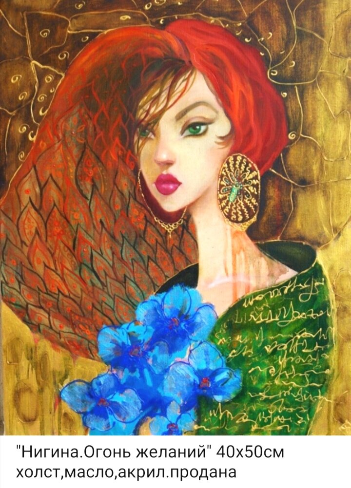 В последнее время наблюдаю тенденцию редких имен у моих заказчиц. Это образ ослепительной, жизнерадостной, энергичной и яркой женщины. Ее глаза, ее волосы, шея – все отражает эту грацию и притяжение. Взгляд полон решительности, это взгляд человека с твердой жизненной позицией, но в то же время - гибкой и хрупкой женщины. Она недосягаема, недоступна, хоть и находится , как кажется, совсем близко... Она знает себе цену. Являет собой роскошь не только внешне, но и внутренне. 🔥Она-огонь! Огонь - энергия важная и трудноуправляемая, но тому, кто смог ею овладеть, она приносит тепло, верно служит. Однако, стоит вывести ее из равновесия…..И можно остаться без крова, получить тяжелые ожоги, ощутить настоящую боль... Ведь огонь может как созидать, так и разрушать. На ее шее красные подтеки, символизирующие горячую кровь, как бы жидкий огонь по коже. Неспроста и её волосы прописаны как чешуйки дракона... Дракон – олицетворение силы, решительности, но в то же время – это спокойствие, терпение