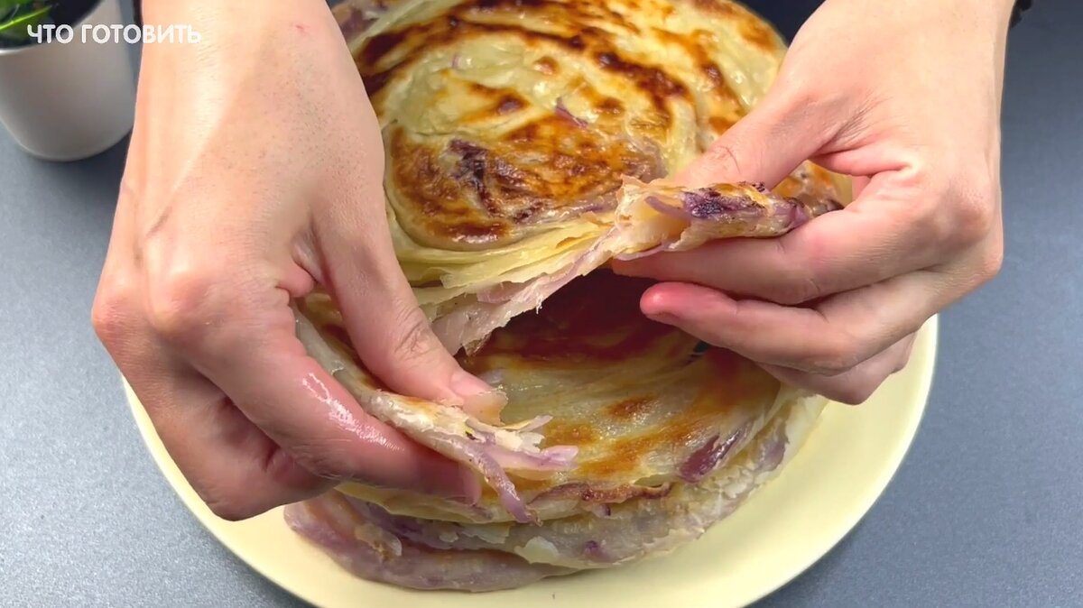 Катлама – отличный вариант, чем заменить хлеб. К примеру, есть небогатый выбор продуктов дома, а хочется чего-то вкусненького. Представляет собой угощение слоеную лепешку из пресного теста, которая очарует приятным вкусом. Попробуйте приготовить ее именно по этому рецепту. Катлама - простая в приготовлении. Попробуете ее приготовить? Жду ваши ответы в комментариях под статьей. Список продуктов: · 1 кг лук; · 500 мл вода; · 1 ч. л. соли; · 100 гр. сливочное масло; · 1-2 ст. муки. В теплую воду всыпаем муку и перемешиваем, добавляем соль. Замешиваем упругое тесто руками. Оставляем в теплом месте под полотенцем на 10 минут. Нарезаем лук на тонкие полукольца. Добавляем к луку соль и перемешиваем. Растапливаем сливочное масло. Посыпаем стол мукой. Раскатываем из теста пласт. Предварительно разрезаем шар на 4 равных части. Каждый шар теста кладем под полотенце и оставляем на столе. Раскатываем тонкие пласты по очереди. Смазываем пласт растопленным сливочным маслом. Каждый пласт посыпаем лук