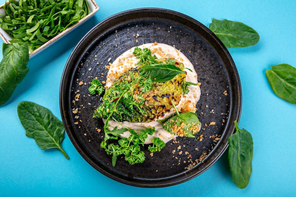 - Выложить майонез на тарелку, сверху – капусту и украсить листьями шпината.