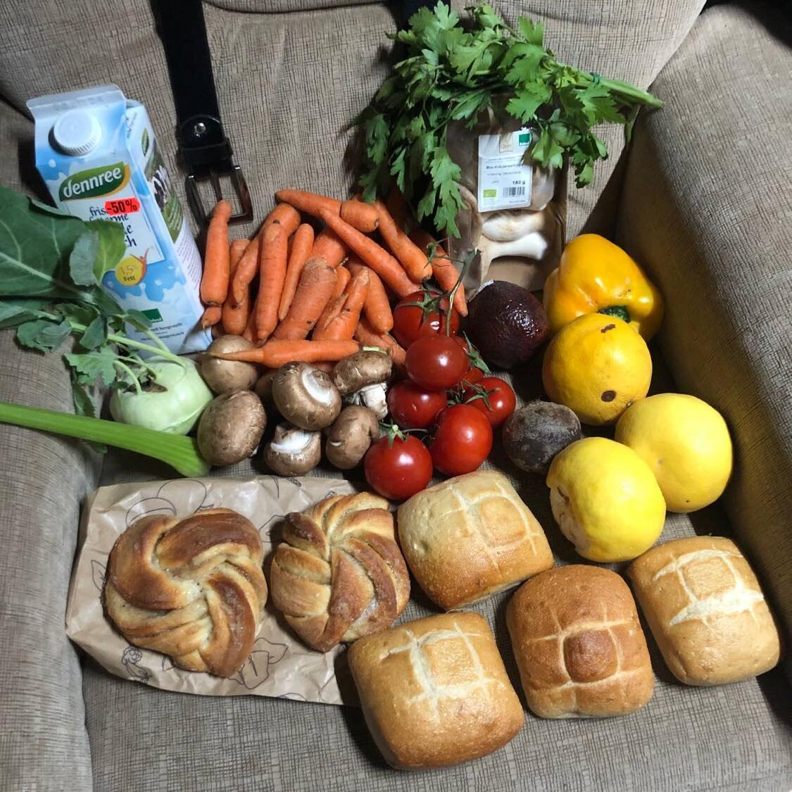 В среду была бесплатка из Био маркета. Я её пропустила, но, видно, пришла не последняя и мне кое-что досталось. Упаковка молока 1,5% - молоко свежее, привезли много, взяла два пакета, второй уже был отправлен в холодильник и на фотосессию не попал. Из овощей - кольраби, один стебель сельдерея ( его любят - разбирают сразу), восемь королевских шампиньонов, одна маленькая свекла, пучок петрушки, восемь небольших помидорчиков ( два из них изрядно примятых, не страшно - обрежу), один большой жёлтый перец, 150 грамм белых грибов ( будет суп), и много морковки отличного качества, не испорченная, упругая, но небольшого размера - сделаю запеканку, рецептом поделюсь. Из фруктов - три грейпфрута, хотя людям, принимающим гипотензивные и сердечные препараты грейпфруты есть категорически противопоказано, так как они в несколько раз усиливают действия принимаемых лекарств, что опасно для больного человека, одно перезрелое авокадо всмятку ( пожадничала, взяла ). Для тех, кто не в курсе, авокадо - эт
