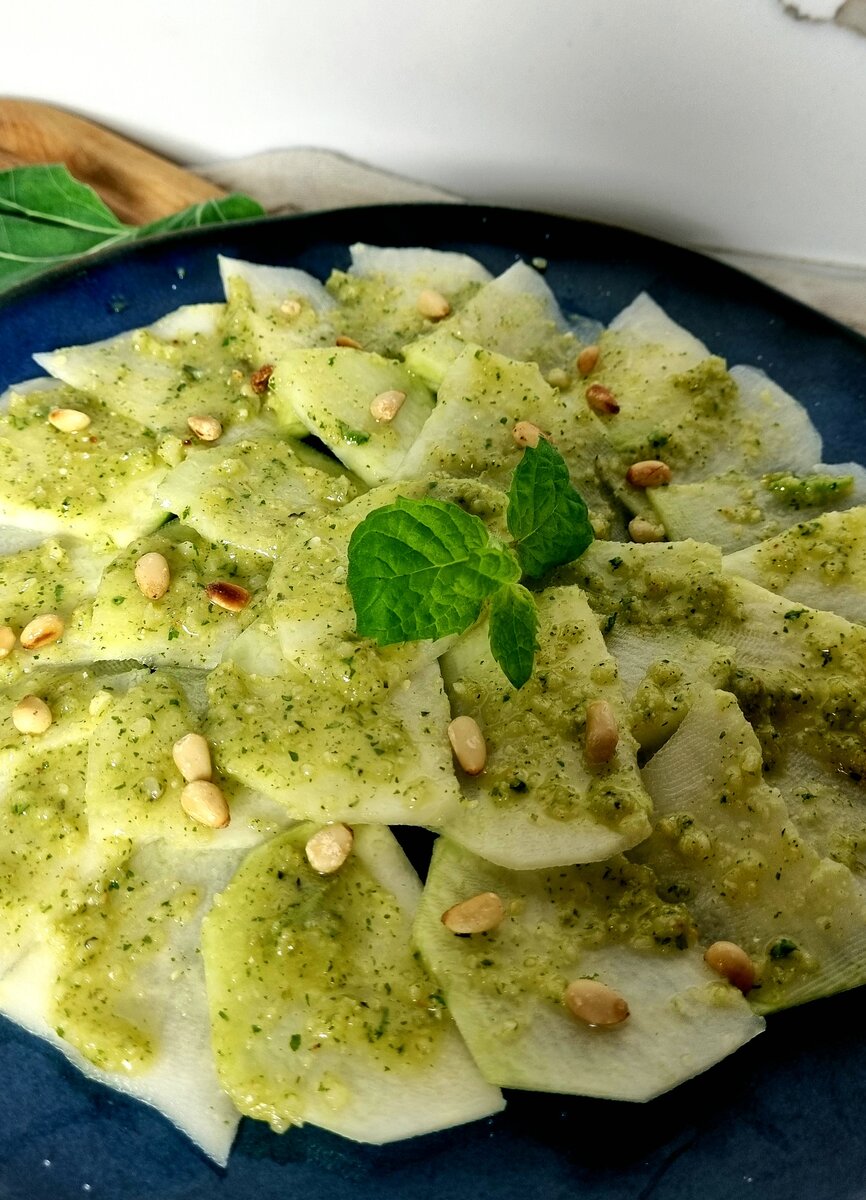 Все в детстве любили кочерыжку? Тогда кольраби - овощ для вас🥰 Капуста кольраби представляет собой так называемый стеблеплод. Сердцевина этого плода нежная и сочная, очень приятная на вкус, чем-то напоминает капустную кочерыжку. Родиной кольраби считается Северная Европа. Название в переводе с немецкого трактуется, как «капустная репа». Кольраби очень полезная и низкокалорийная, всего 27 ккал. В ней содержится большое количество витамина С, недаром ее называют лимоном с грядки. Помимо этого в ней витамины А, В, РР, В2, кальций, калий, фосфор, магний, каротин, кобальт и железо. Нежные и сочные стеблеплоды с белой мякотью содержат глюкозу и фруктозу, что легко усваивается организмом и дает чувство сытости. Что же приготовить из кольраби? Самый простой салат - это потереть с морковкой и заправить йогуртом и майонезом. А мы приготовим кое-что посложнее и поинтереснее - карпаччо из кольраби с песто из мяты. Ингредиенты: На 2 порции 1. Кольраби очистить от кожуры и нарезать тонкими кольцами