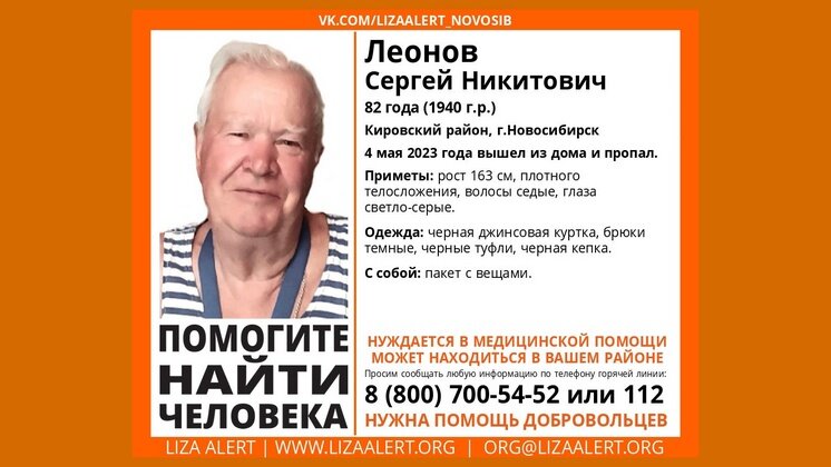 В Кировском районе Новосибирска без вести пропал 82-летний Сергей Леонов, который 4 мая 2023 года вышел из дома и исчез. Об этом рассказали в пресс-службе поисково-спасательного отряда (ПСО) «ЛизаАлерт». Приметы пропавшего: рост 163 сантиметра, плотное телосложение, волосы седые, глаза светло-серые. В день исчезновения был одет в черную джинсовую куртку, темные брюки, черные туфли и кепку. При себе имел пакет с вещами. Если у вас есть информация о местонахождении Сергея Леонова, сообщите об этом по телефону ПСО 8-800-700-54-52 или наберите 112. Мужчина нуждается в медицинской помощи, поэтому найти его нужно как можно скорее. Ранее «Вести Новосибирск» рассказывали, что в регионе нашли живым пропавшего без вести 17-летнего юношу.