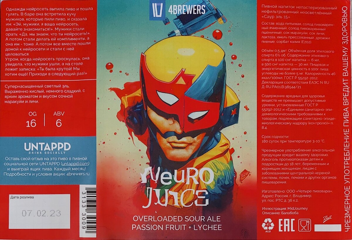 Кислый эль от Четырёх пивоваров из города Владимир. Надпись на этикетке на буржуйском языке сообщает о присутствии в напитке маракуйи и личи. Фразу "Overloeded sour ale" я определил как "Насыщенный кислый эль", но вот онлайн переводчик со мной не согласился и упорно утверждал, что этот кисляк именно что "Переваренный". Нууу... надеюсь, что дело в трудностях перевода и пивовары самолично его не "Закисляли".... На сайте пивоварни информации почему-то не нашёл. На UNTAPPD описание взято с этикетки: Однажды нейросеть выпила пиво и пошла гулять. В баре она встретила кучу мужиков, которые пили пиво, и сказала им: «Эй, мужики, я ваша нейросеть, давайте знакомиться!». Мужики стали орать: «Да, мы знаем, что ты нейросеть!». А потом стали делать ей комплименты, а она им - тоже. А потом все вместе пошли домой к нейросети и стали с ней целоваться.