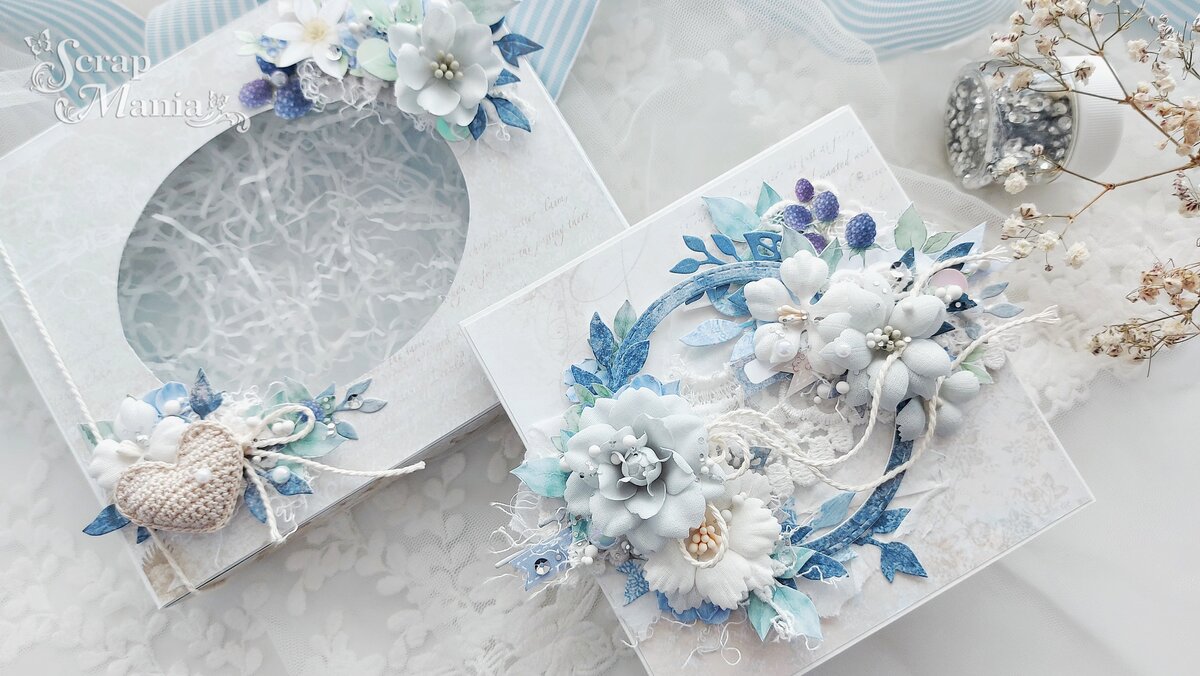 Добрый день! С вами Елена Иванова. Сегодня я хочу показать открытку из нашей новой весенней коллекции "Небесная роса" для хранения которой, дополнительно, я сделала красивую коробочку с окошком. Основа открыточки и коробочки - акварельная бумага. Лицевая сторона открытки декорирована вырубкой, кружевом, цветами и топпингом. Во внутренней части открытки есть карман из кальки для поздравительной карточки или денежного подарка. Для создания вырубки использовала нож "Листья мелкоцветов" и вырезанные элементы из листов коллекции 10х30см Для декорирования коробочки использованы те же элементы, еще композицию дополнила вязаным декором в виде сердца. Материалы ScrapMania: