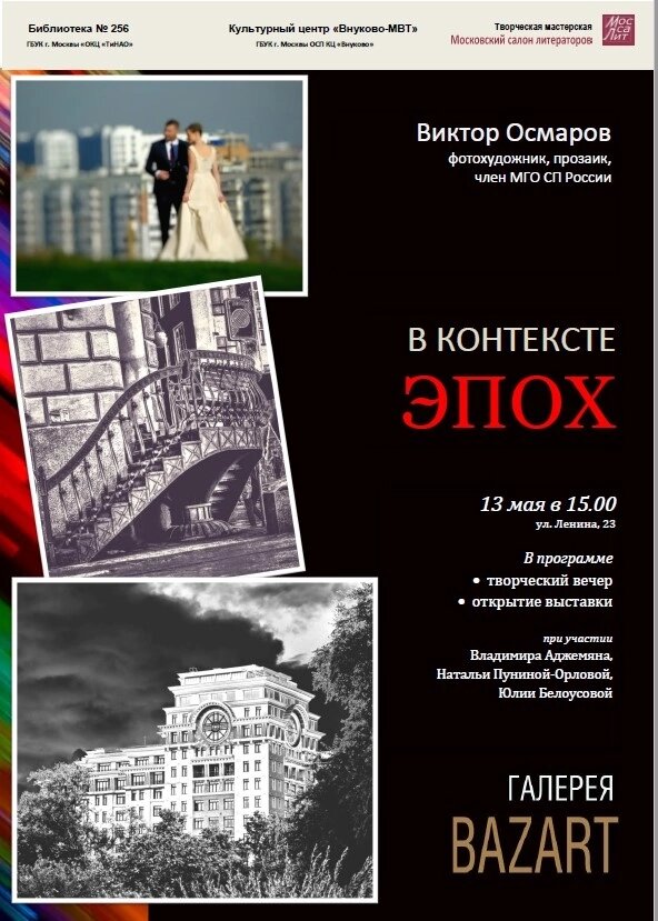 Творческая мастерская Моссалит и литературное объединение Отдел ВЕДИ приглашает: Дорогие Друзья! 13 мая в 15.00 в Галерее BAZART при поддержке КЦ Внуково-МВТ и библиотеки № 256 состоится открытие фотовыставки "В КОНТЕКСТЕ ЭПОХ" историка, прозаика, фотохудожника, члена МГО СП России Виктора Осмарова. Вернисаж состоится при участии литераторов ЛИТО "Отдел ВЕДИ" (ссылка на группу ВКонтакте) и авторов Моссалита. По окончании выставки понравившиеся фотоработы можно будет приобрести. Адрес: КУ ВНУКОВО-МВТ, ул. Ленина, 23 Приглашаем всех ценителей качественной современной литературы и любителей классического отчечественного фотоискусства. #галереяBAZARTвконтекстеэпох #галереяBAZARTвикторосмаров #моссалитвикторосмаров #галереяBAZARTвнуковомвт #галереяBAZARTбиблиотека256 #ТворческиеновостиСНЛ #отдел_веди