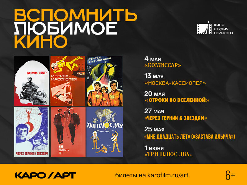 С 4 мая проект КАРО.Арт и Киностудия им. Горького приглашает в кинотеатры посмотреть «золотую коллекцию» фильмов на большом экране, которые пройдут в течение всего мая.