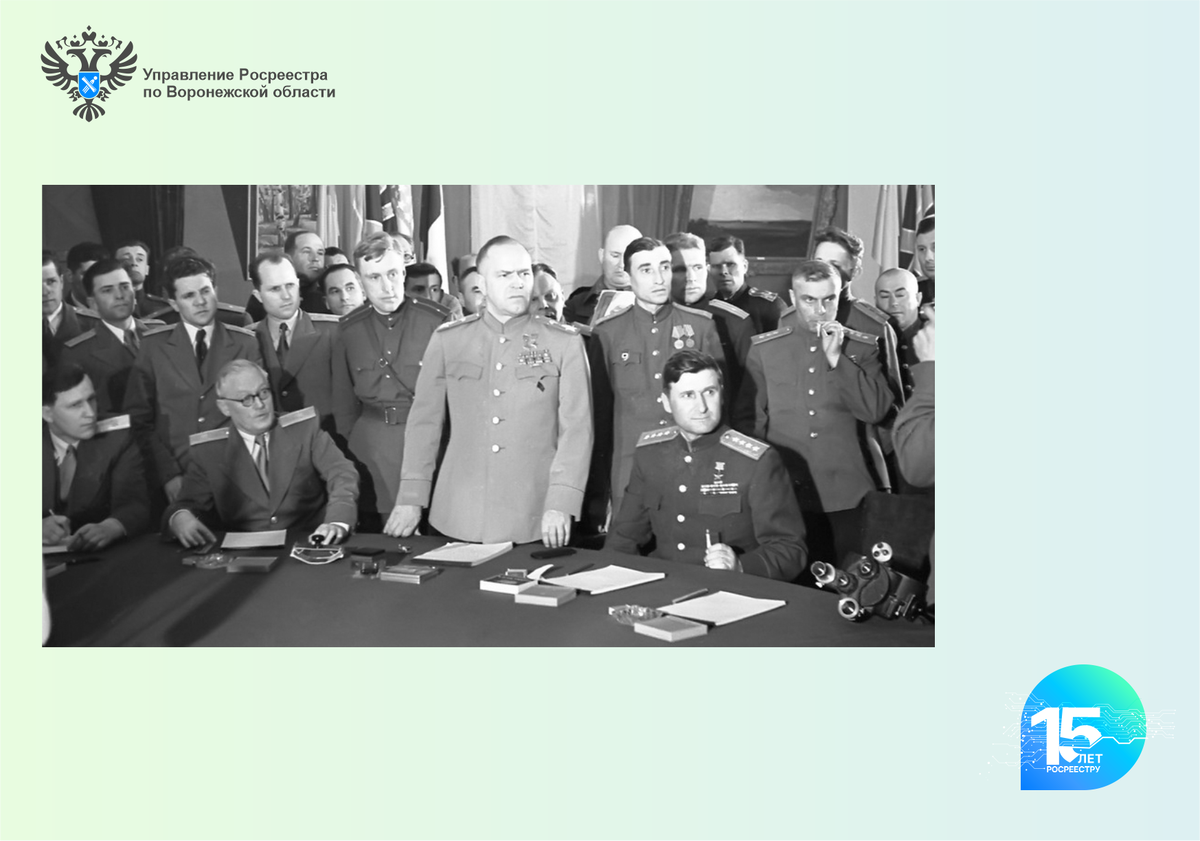 Принятие безоговорочной капитуляции фашистской Германии от советской стороны было поручено командующему 1-м Белорусским фронтом Маршалу Советского Союза Георги