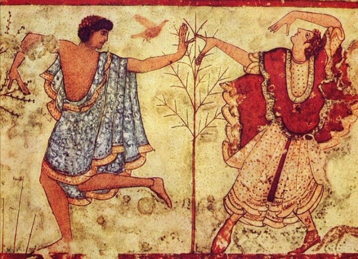 Этруски, Этрусцы, Троянцы, Тирены, Туски жили в Этрурии, которая занимала почти весь Апеннинский полуостров, правили племенем Пеласгов, до революции Русские историки называли Этрусков Пеласгами. Этруски были родствены Тюркам и наименование племен похожи. Общались Этруски с Сардинией, Карфагеном, с Египтом и с Финикией, носили тогу с пурпурной полосой, которую окрашивали в Финикии. Этруски привезли из Карфагена дерево гранат и культивировали дерево гранат, в Италии любят лимоны, апельсины и гранаты. Этруски активно замались постройкой кораблей, путешествовали в Средиземном море и даже занимались морскими боями с Греками. Танцующие Этруски на фреске в гробнице Триклиния и Этруски мызыканты на фреске, танцуют и музицируют Этруски рядом с гранатовыми деревьями. Этруски занимались металлами и изготавливали оружие и доспехи из бронзы и из метеоритов, в метеоритах почти чистое железо с примесью никеля, железные ножи ценились в Бронзовый век и когда человечество научилось выплавлять жел