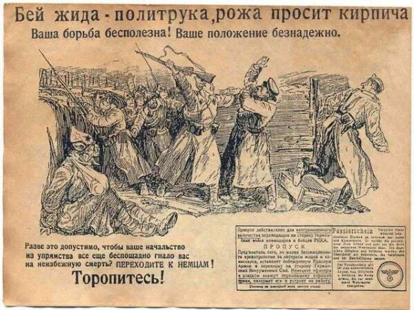 Среди солдат Советской Армии гитлеровцы распространяли вот такие листовки, в которых советским солдатам предлагалось убивать своих политруков и сдаваться в плен.