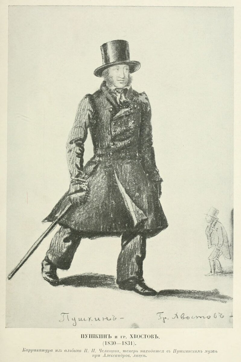 Пушкин и граф Хвостов. Карикатура из альбома генерала П. Челищева. 1830-1831 годы.