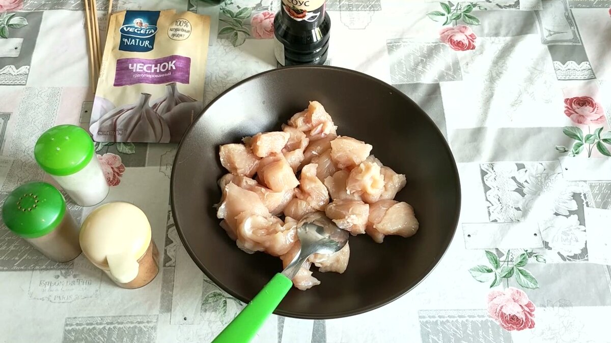 7 Мая в Казахстане праздник: "День защитника отечества". Праздник, весна в разгаре и можно выехать на природу, жарить шашлыки. А можно дома сделать шашлычки в духовке. Понадобится: 1/2 куриного филе, 1 столовая ложка растительного масла, 1 чайная ложка сухого чеснока, 2 столовые ложки соевого соуса, соль, черный перец, красный перец по вкусу, деревянные шпажки. Филе нарезать крупными кубиками Добавить соль Черный перец Красный перец Сухой чеснок, перемешать Добавить соевый соус, перемешать Через 30 минут еще раз перемешать Надеть на шпажки Переложить на противень, застеленный пергаментной бумагой Смазать растительным маслом. Поставить в духовку, разогретую до 180 градусов Через 30-35 минут можно подавать Подробнее на видео Источник: канал "4етыре ложки" на You Tube Приятного аппетита!
