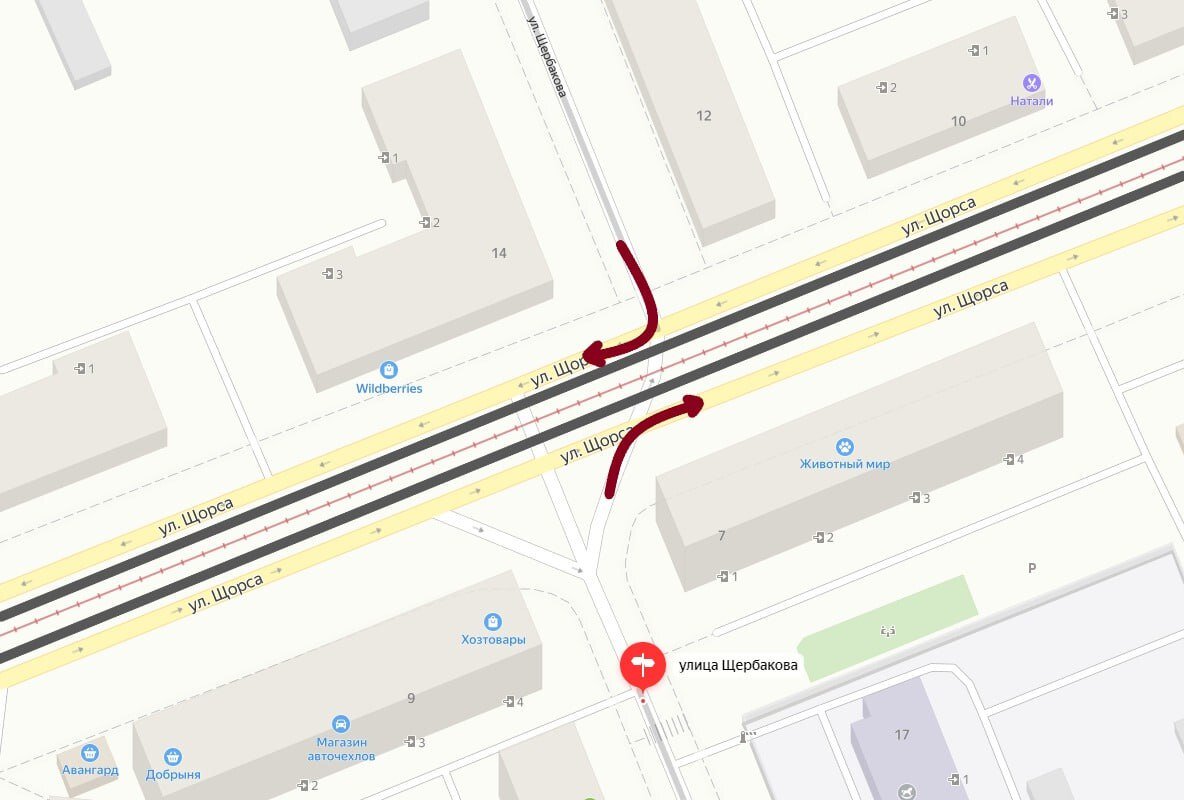 Теперь с Щербакова повернуть можно только направо на улицу Щорса. При этом двигаясь по Щорса нельзя поворачивать налево на улицу Щербакова. Изменения ввели, как объяснили в администрации города, из соображений безопасности: — Не каждому автовладельцу удавалось пересечь пять полос автомобильного движения и две трамвайные линии без ущерба для своего автомобиля и без риска для здоровья. В итоге — повреждённые автомобили, перегороженные проезды, стопор движения трамваев. Чтобы развернуться, теперь автомобилистам придётся проехать до ближайших перекрёстков — на 230-260 метров дальше, чем обычно.