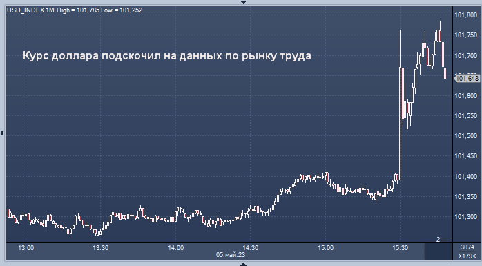 Доллар подскочил до дневного максимума после отчета о занятости в США График индекса доллара интервалом в 1 минуту Доллар восстановился после отчета США о занятости. Спотовый индекс доллара вырос на 0,2%; индекс снижался до публикации данных. Евро/доллар США падает на 0,3% до 1,0977; пара торговалась по 1,1015 перед отчетом. Доллар США/иена вырос на 0,4% до 134,85 против 134,25 до отчета. Рост числа рабочих мест в США в апреле был выше, чем ожидалось, что напомнило об устойчивости экономики США, несмотря на то, что Федеральная резервная система сигнализировала о том, что она «приближается» к приостановке цикла повышения процентных ставок. По данным Бюро статистики труда, в прошлом месяце в США было добавлено 253 000 рабочих мест в несельскохозяйственном секторе, что не оправдало ожиданий замедления. Однако показатели за предыдущие два месяца были резко пересмотрены в сторону понижения. Уровень безработицы также оказался ниже, чем ожидалось, на уровне 3,4% по сравнению с консенсус-прог