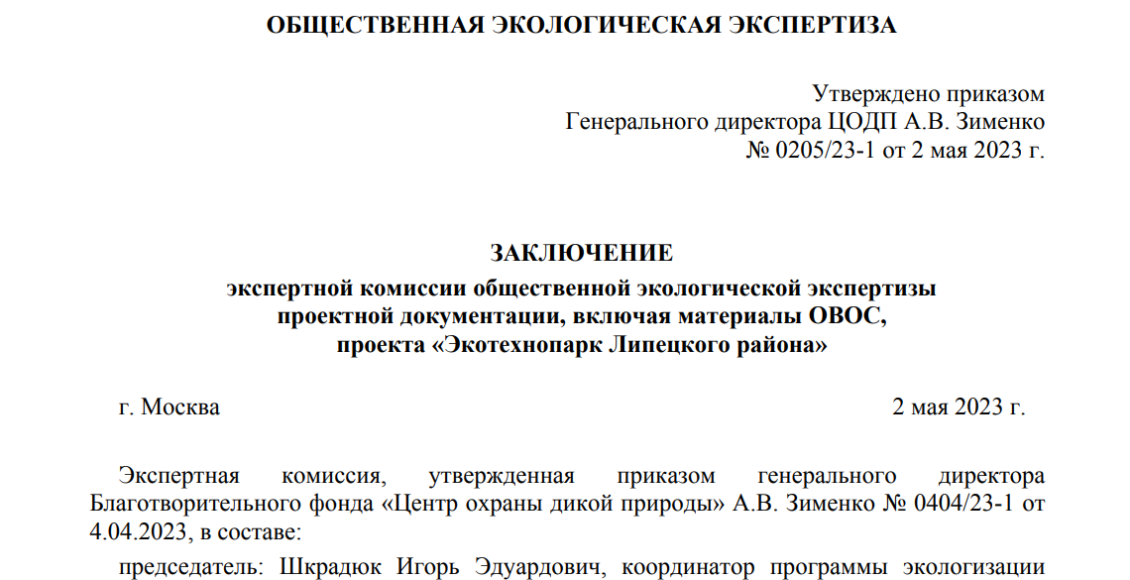 Благотворительный фонд «Центр охраны дикой природы» сообщил о завершении общественной экологической экспертизы проектной документации и материалов оценки воздействия на окружающую среду проекта “Липецкий окружной экотехнопарк”, которую он провел на основании письма-обращения жителей Липецкой области. Как отмечается в заключении экологов, “проектные решения противоречат законодательству Российской Федерации, имеют существенные недоработки по экологическим, техническим и социальным параметрам, не обеспечивают экологическую безопасность намечаемой деятельности и, следовательно, проект не может быть реализован”. Эксперты указывают на то, что изыскательские работы по проекту проводились не в полном объеме, проектная документация содержит расчеты и данные, взятые с других территорий (Магадан), а выбор места планируемой деятельности не соответствует требованиям законодательства о гидрогеологических условиях, Кроме того, в результате эксплуатации объекта, считают общественники, будут загрязнен