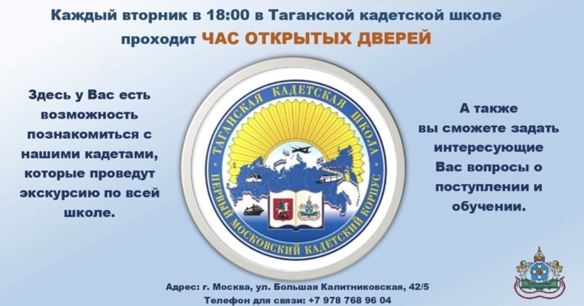 🌈 Уважаемые родители! 🌸Каждый вторник 🤗В 18:00 #ТаганскаяКадетскаяШкола Первого Московского кадетского корпуса приглашает своих будущих воспитанников с семьей и друзьями познакомиться с нашей школой, ее традициями и интересно с пользой провести время!) 🌟Ждём вас по адресу: г. Москва, улица Большая Калитниковская, д. 42/5 ☎По всем вопросам обращайтесь по номеру телефону: +7(978)768-96-04 #ПервыйМосковскийКадетскийКорпус #ГБОУПМКК #ПМКК #МРСД33 #ДОНМ #ДопОбразование #САО #ЧасОткрытыхДверей #кадеты