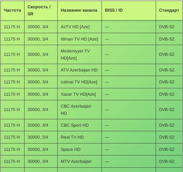 Спутник AzerSpace 1- 46.0°E Что изменилось за последнее время Какие каналы добавились BISS KEYS (бисс ключи)на 2023 по всем спутникам Таблицы PowerVU Keys, ключи 2023 г. по Спутниках Отобранные списки каналов на спутнике AzerSpace 1 46.0°E ЧастотаСкорость / SRНазвание каналаBISS / IDСтандарт 11024 V 16500 3/4 луч CAsia 11025 V 12700 5/6 луч Europe 11095 H 30000 5/6 луч Europe 11105 V 13000 3/4 луч CAsia 11175 H 30000 5/6 луч CAsia