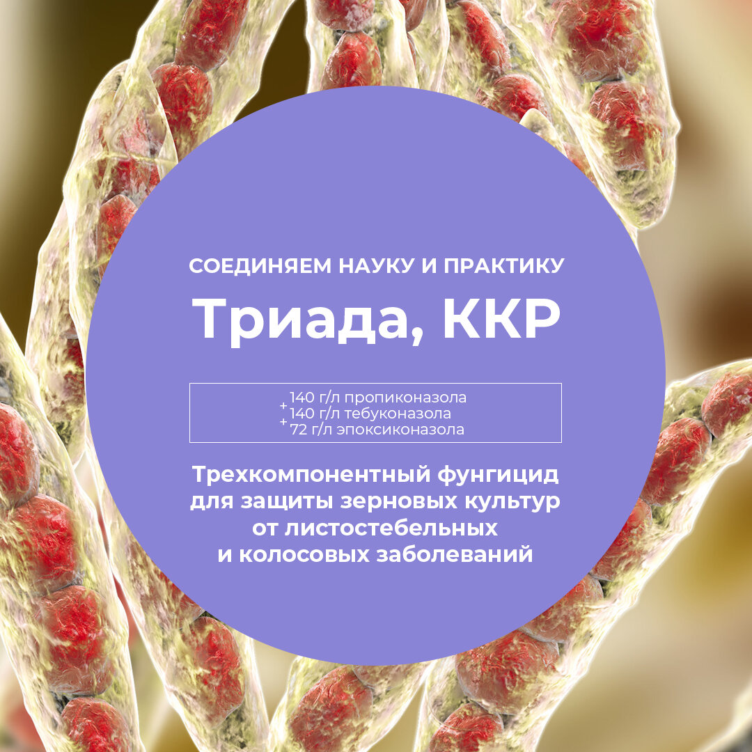Незаменимый препарат в борьбе с листостебельными заболеваниями зерновых культур. Получите зерно высокого качества с защитой от наиболее опасных заболеваний. Триада, ККР обеспечивает максимальную эффективность против: Фунгицид обеспечивает быстрый лечебный эффект за счет коллоидной формуляции и защищает культуру до 40 дней, а при воздушной засухе Триада, ККР проявляет эффект «зеленого листа». В полевых испытаниях препарат показал отличные результаты. Через две недели после обработки озимой пшеницы фунгицидом Триада, ККР отмечена высокая токсичность по отношению к возбудителю септориоза. Снижение развития этого заболевания на флаговом листе составило 91,4%, на втором и третьем — 82,3-83,6%. В целом, распространение септориоза снизилось на 68%. Что касается бурой ржавчины, то через 24 дня после обработки на варианте с Триада, ККР было зафиксировано 100%-ное подавление этого возбудителя. В полевых испытаниях против возбудителя септориоза на озимой пшенице Триада, ККР показала 100% эффектив