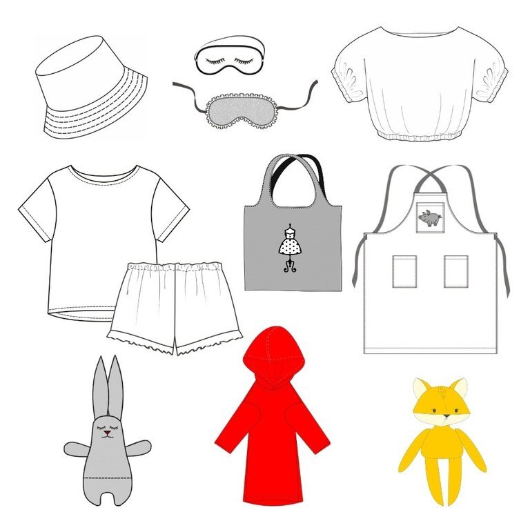 1. Панама - унисекс фасон, размеры от детского до мужского. 2. Маска для сна - защищает от утреннего солнца 3. Кроп-топ 4. Пижама 5. Сумка-шоппер - для покупок и как летний аксессуар 6. Фартук - для кухни и хобби 7. Свитшот для кота или маленькой собачки 8. Зайчик-мешочек для трав, чая, конфет 9. Игрушка Лисичка На все выкройки скидки 30% 🔥