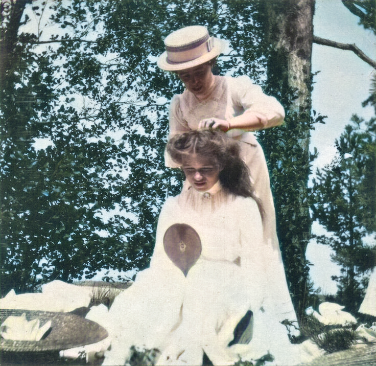 На этом фото мы видим княжну Ольгу, которую заплетают на прогулке. Смотрится она в красивое зеркало, которое держит между колен. А рядом лежит шляпка, ожидающая хозяйку На этом фото запечатлены Таня с Машей, которые играют в парке. Маша прикрыла лицо рукой. Будто в шоке с чего-то. Выглядит это весьма забавно и весело А здесь маленькая Маша стоит рядом с офицером и слегка стесняется. Всё это происходит в Петергофе. Улыбка княжны поражает в самое сердце Фотография Оли и Тани на пляже. Княжны с чего-то весело смеются и бегут в сторону. Возможно Таня пошутила над Олей и та пытается её догнать) А на этой фотографии Настя корчит смешную рожицу. Не зря её называли "Швыбзик" в семье. Она часто всех смешила и при этом оставалась серьёзной Ещё одна фотография Великих Княжон на свежем воздухе. Тут Машка решила сделать сестре небольшие усы для фотографии Маша весело лежит в санях, усыпанная белым снегом. Возможно она упала и снова забралась в свои сани. Впереди видны ещё сани, которые привязаны к