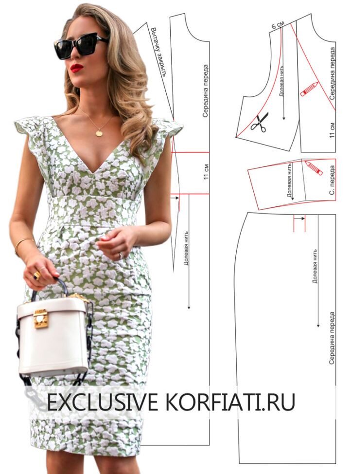 Какое бы количество платьев вы не сшили для своего гардероба, мы уверены, что, познакомившись с изделием, которое мы предлагаем в этом уроке, вы обязательно загоритесь идеей сшить себе еще одно платье. Посмотрите, и убедитесь сами! Эта элегантная модель вполне может служить образцом стиля, ведь в ней лаконично сочетаются фасон, длина и ткань. Воланы-крылышки добавляют каплю игривости, и изделие становится еще более притягательным. Роскошный жаккард сдержанных бело-оливковых тонов завершает картину! Выкройка платья с крылышками — в этом уроке. Длина платья от талии — 66 см. Для моделирования выкройки, переснимите на кальку отдельно спинку и перед.