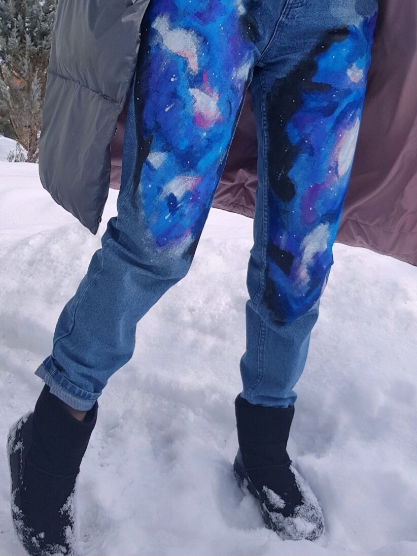 Первыми раскрашенными джинсами в моей коллекции стали космические джинсы. Такой большой рисунок смотрится великолепно🤩